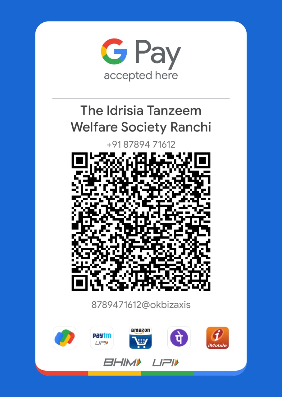 NEFT / RTGS: In Favor Of: The Idrisia Tanzeem Welfare Society Bank: Bank Of Baroda Branch: Main Road, Ranchi Account No: 00170200001006 IFSC: BARB0RANCHI